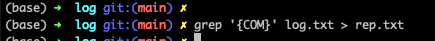 (base) ➜ log git:(main) ✗ grep '{COM} ' log.txt > rep.txt 을 실행